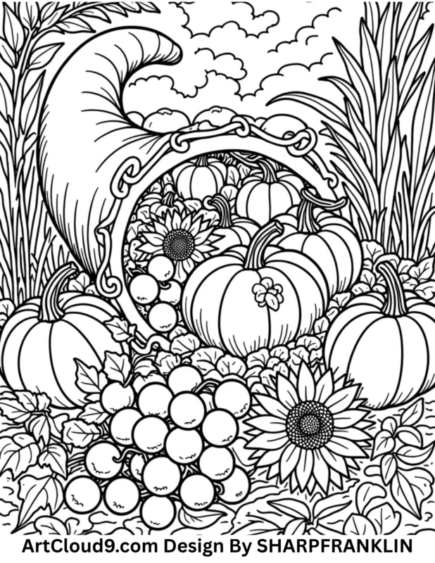 Our Thanksgiving coloring pages celebrate gratitude, harvest, and togetherness. You’ll find autumn leaves, detailed pumpkins, rustic farm animals, and warm fall landscapes — all drawn in ArtCloud9’s signature ultra-detailed adult coloring style.